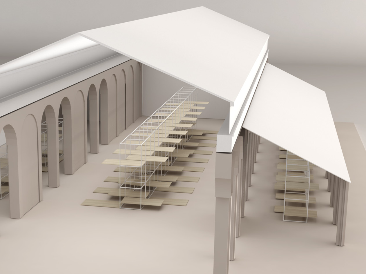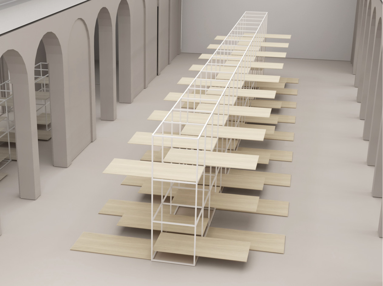 Per l’allestimento della mostra, Studio Bello Dias ha pensato ad un allestimento realizzato con un sistema modulare. Una struttura metallica, prefabbricata, che compone una griglia dove vengono inseriti pannelli in truciolare, di dimensione standard, che servono da piano d’appoggio orizzontale e da divisorio verticale. L’obiettivo è quello di creare una struttura flessibile, facile da montare e da trasportare per poter essere utilizzata anche come mostra itinerante.