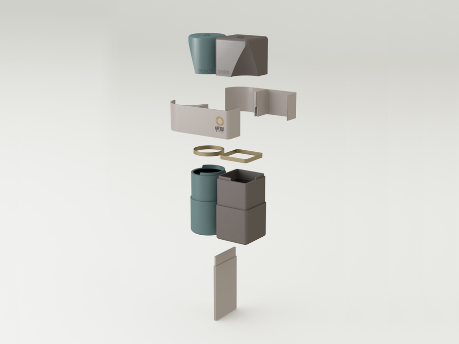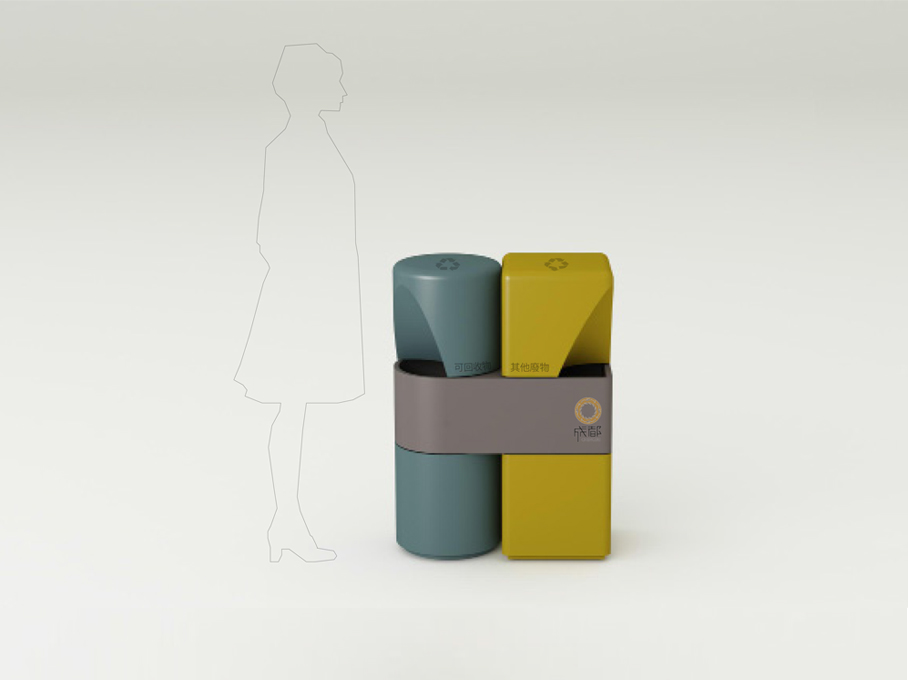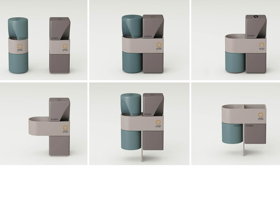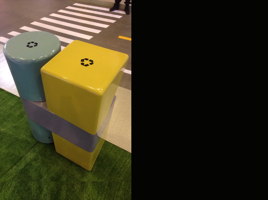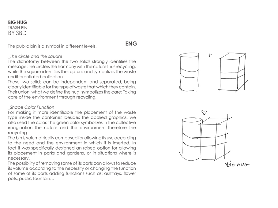 For making it more identifiable the placement of the waste type inside the container, besides the applied graphics, we also used the color. The green color symbolizes in the collective imagination the nature and the environment therefore the recycling. The bin is volumetrically composed for allowing its use according to the need and the environment in which it is inserted. In fact it was specifically designed an raised option for allowing its placement in parks and gardens, or in situations where is necessary. The possibility of removing some of its parts can allows to reduce its volume according to the necessity or changing the function of some of its parts adding functions such as: ashtrays, flower pots, public fountain…