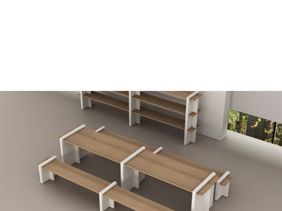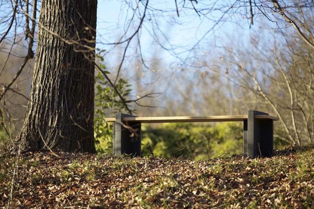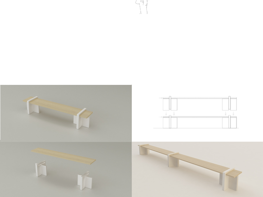 The inspiration for this modular garden bench project comes from a game: a simple encounter between a fir axis, treated for outdoor use, that fits perfectly and slides through two mass-dyed polyethylene trestles.