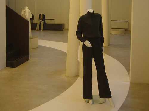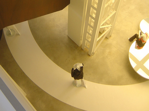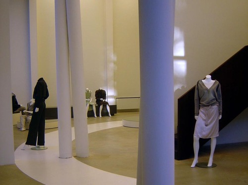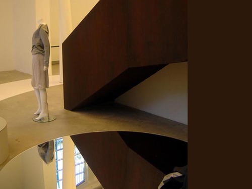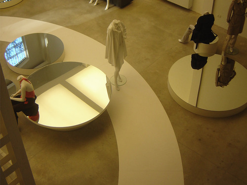 The new figures of the slightly inclined slender cylindrical pillars are combined with luminous ceilings featuring large quadrangular portions that reflect on the seating and the mirrored display platforms on the ground floor. Everything has been custom designed by the Studio.