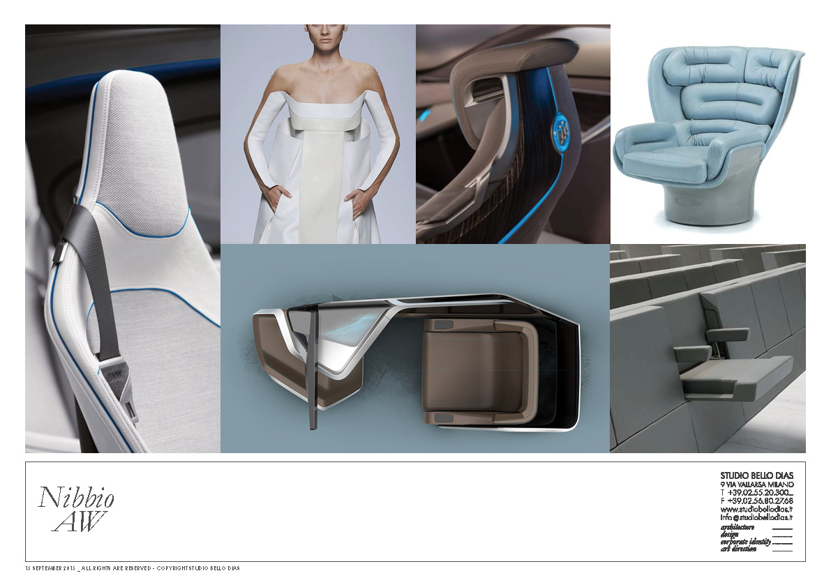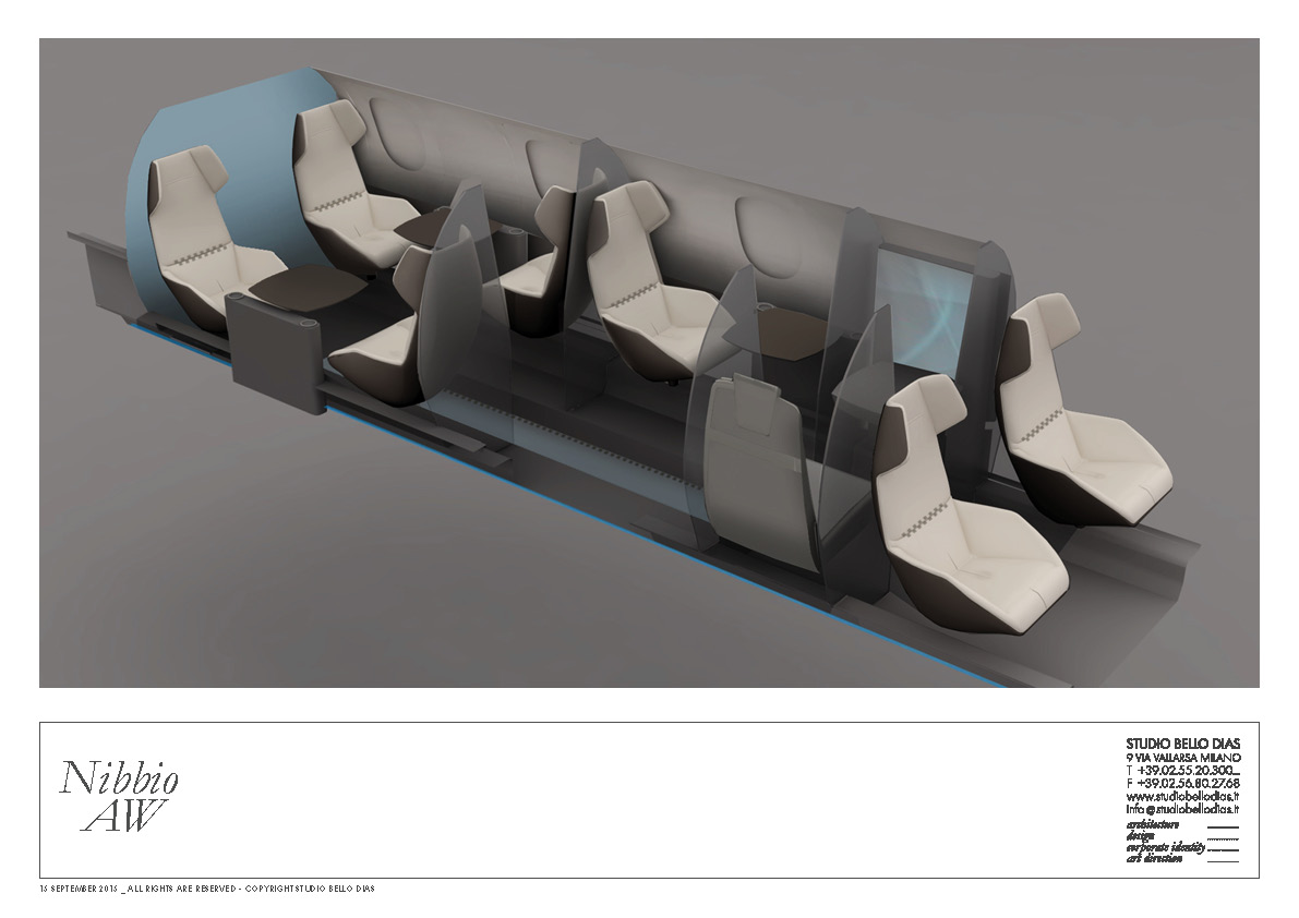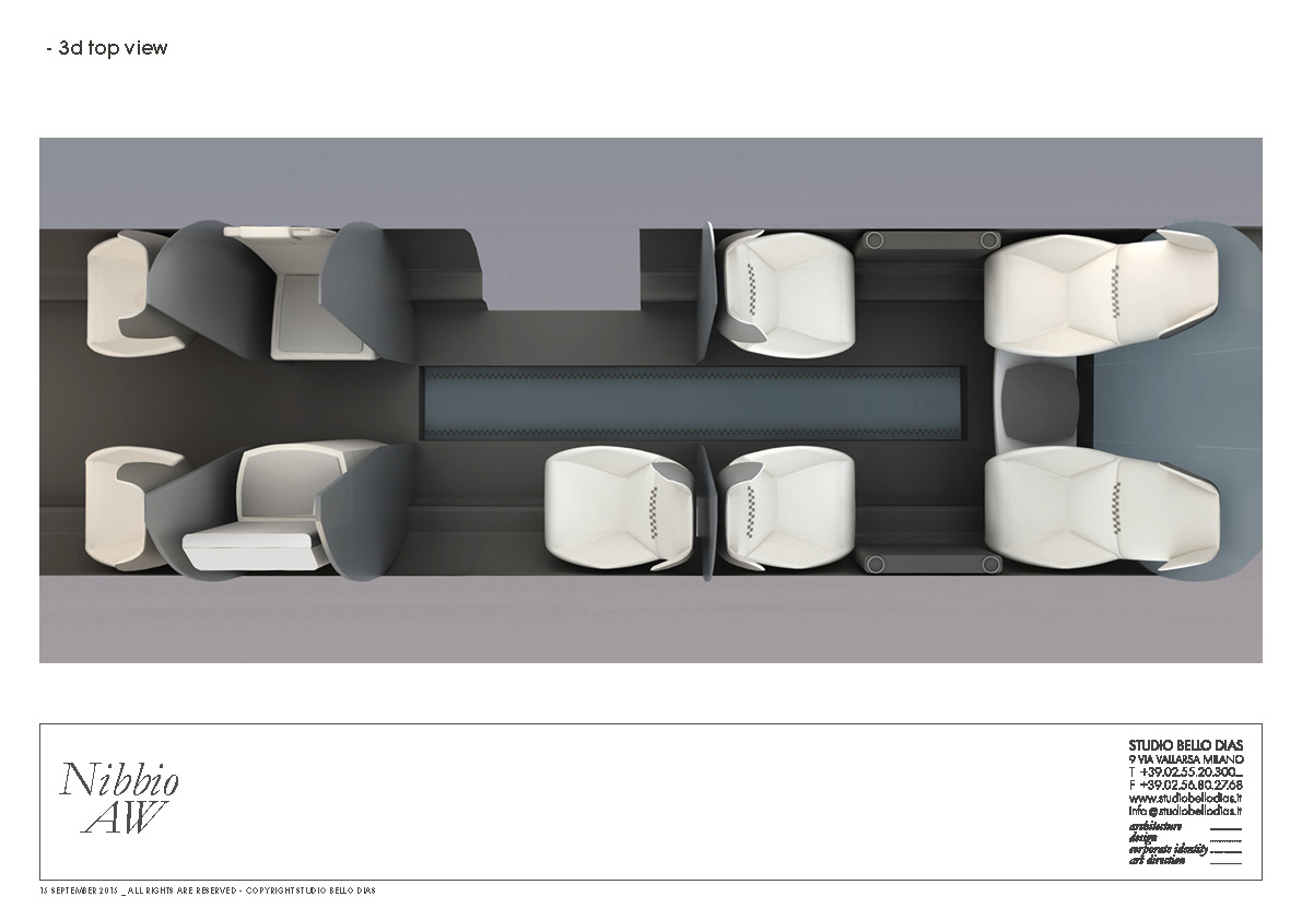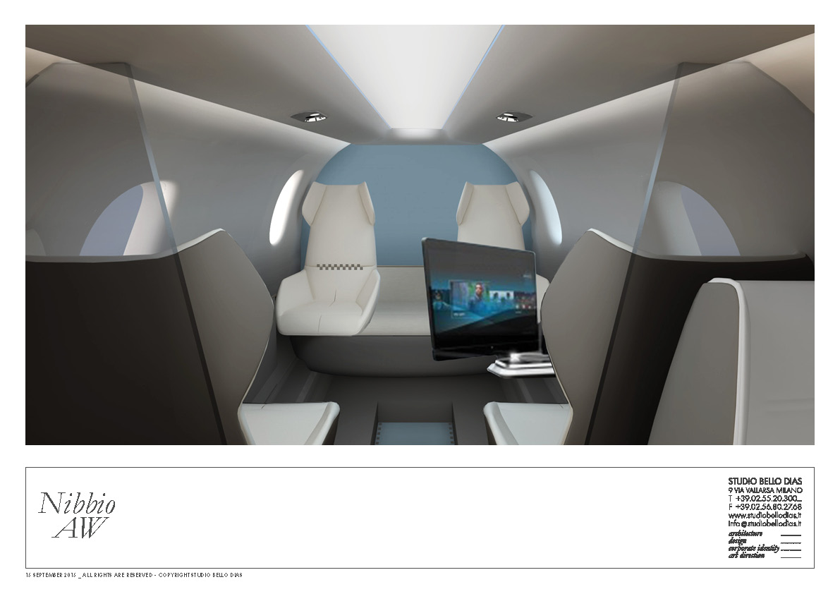 Studio Bello Dias ha pensato per Agusta un prodotto che abbia questa intenzione, ovvero quella di spostare il limite verso il futuro, senza dimenticare le origini e le forme del confort. All’interno di Nibbio infatti convivono elementi high-tech di ultima generazione (dalle linee del design degli interni alla domotica) con forme di memoria che riportano ad un ambiente più rassicurante e accogliente,