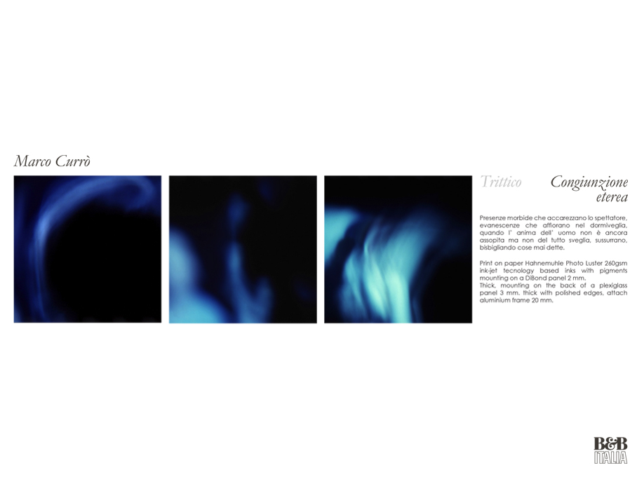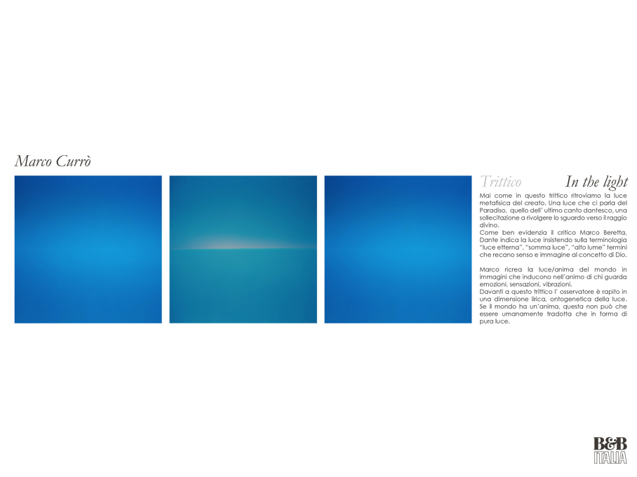 Marco Currò, apresenta Lucigrafie, obras de grande impacto emocional, onde a luz é protagonista, uma pesquisa de sentido e visão espiritual.