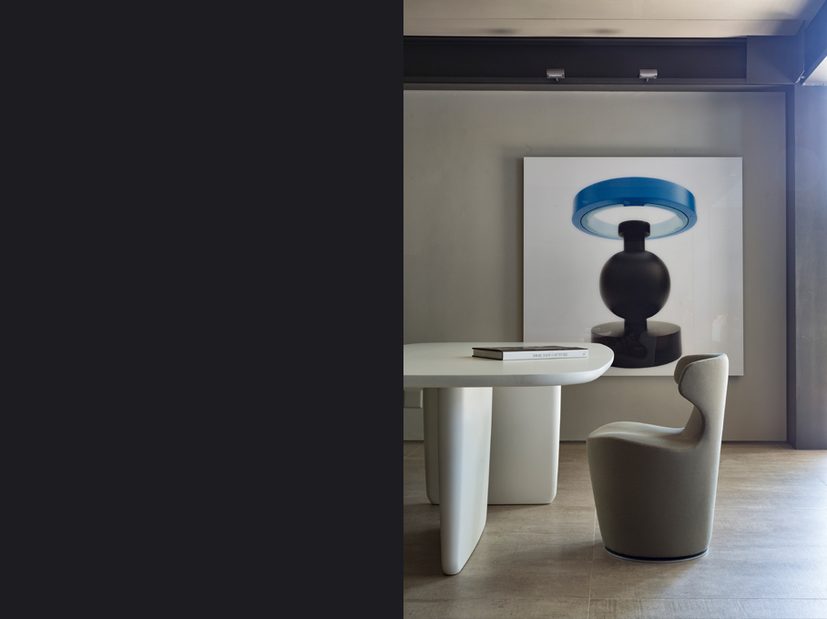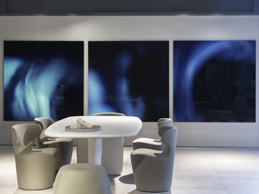 O showroom, projetado pelo arquiteto e designer Ricardo Bello Dias, é concebido como uma galeria de arte que reúne e coloca em sinergia industrial design e obras de arte.